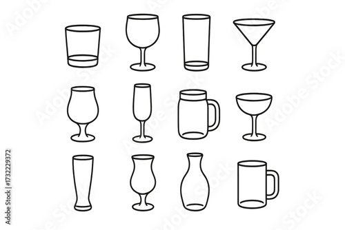Glassware line icon set for drinks and beverages. Vector collection of empty glasses for bar menu or party. Includes wine, beer, cocktail, whiskey, and water glass. Editable stroke.