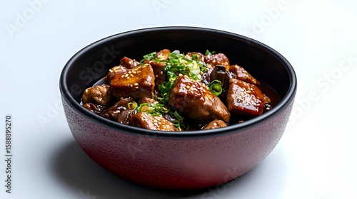 Glazed pork belly chunks with sesame seeds and green onions served in dark ceramic bowl on white background, traditional Asian cuisine preparation.