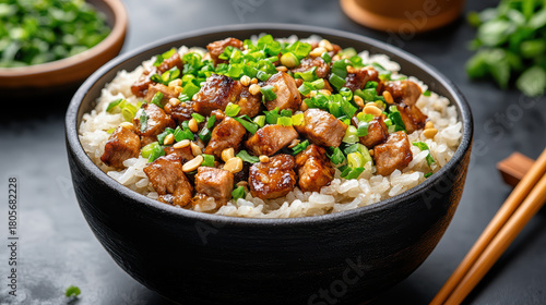 Glazed pork rice with scallion and pine nut garnish, comforting savory bowl