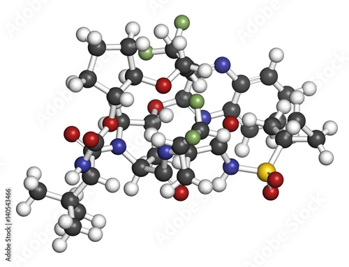Glecaprevir hepatitis C virus drug molecule. 3D rendering. Atoms are represented as spheres with conventional color coding.