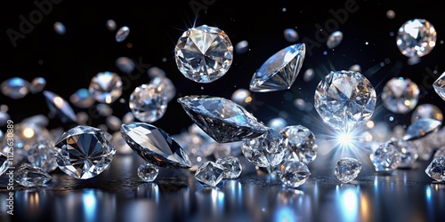 Glistening diamonds cascade against a dark backdrop, showcasing their breathtaking shapes and brilliance in a mesmerizing display of nature’s most precious gems.