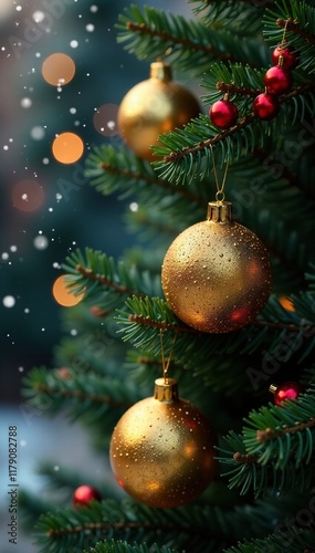 Glittering golden ornaments on a black tree branch amidst winter foliage, celebrations, foliage