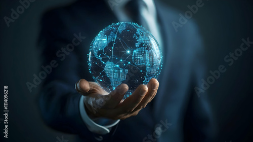 Global Business Network Symbolized by Businessman with Digital Globe.