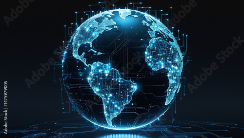 Global digital network visualization with glowing circuits forming a world map sphere on dark background. Symbol of worldwide data flow and tech connectivity.