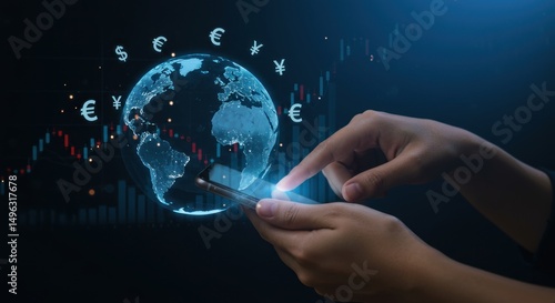 Global financial technology. Hands interact with a holographic globe, overlaid with currency symbols and stock market data, representing international commerce and digital transactions