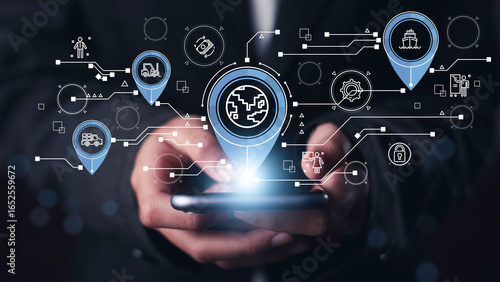 Global logistics and real-time tracking concept with mobile device showing digital map pins for shipping, delivery, warehouse, Supply chain operations, enhancing worldwide distribution efficiency.