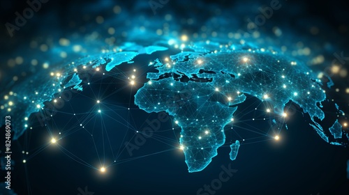 Global network background with digital earth map, connected lines, and glowing nodes representing worldwide communication and data exchange.
