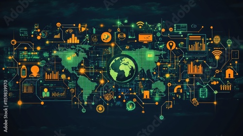 Global network connections: digital world map with data integration and technology icons
