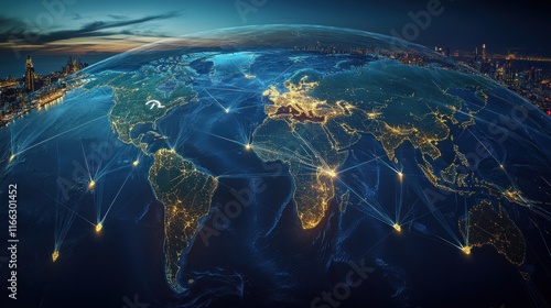 Global network visualization with illuminated cities.