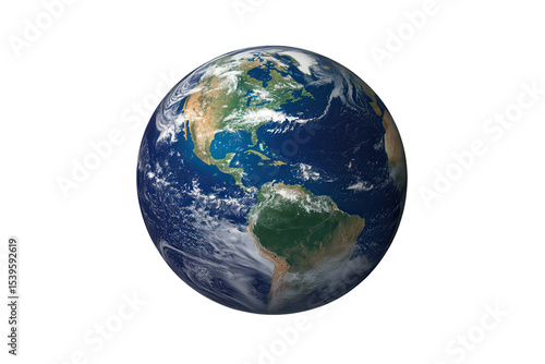 Globe depicting Earth viewed from space featuring North and South America with clouds on transparent background