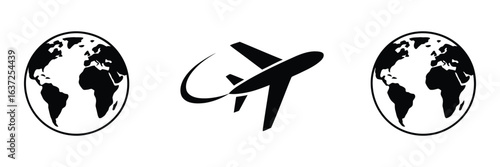 globe icons set with airplane flying around earth for travel tourism world trip journey concept vector