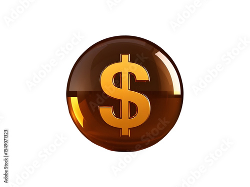 Glossy Amber Glass Sphere Encasing Gold Dollar Sign 3D Render isolated on a transparent background