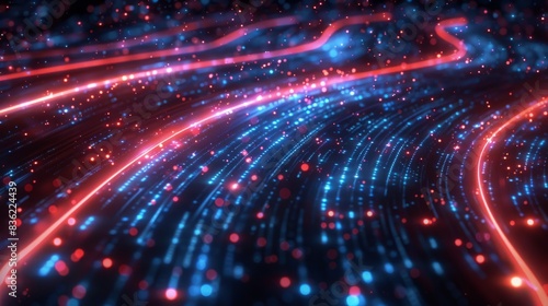 Glossy Black Surfaces with Glowing Red and Blue Neon Lines: High-Speed Data Network and Fiber Optic Internet.