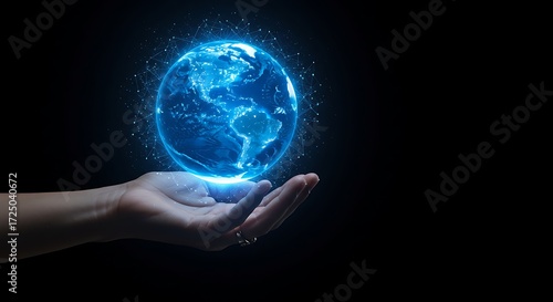 Glowing Blue Earth Globe Held in Open Hand on Dark Background