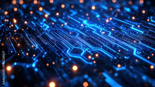 Glowing blue electronic circuit board with orange dots