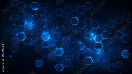 Glowing blue hexagons create a futuristic network pattern on a dark background.