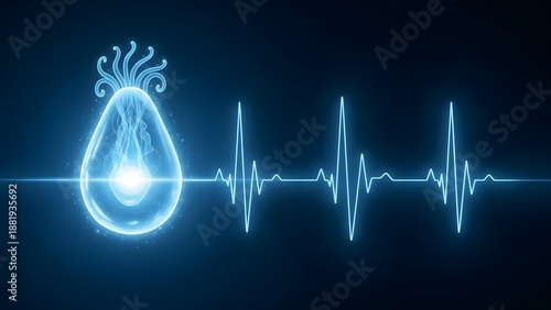 Glowing blue teardrop with electrocardiogram waveform on dark background