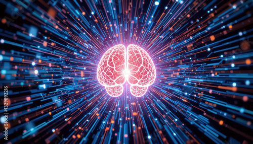 glowing brain illustration surrounded by dynamic neon light streaks, symbolizing innovation and technology