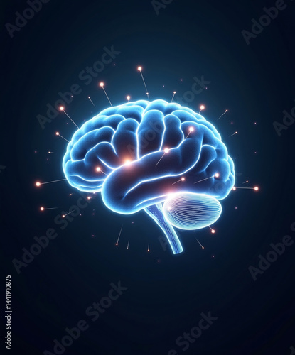 Glowing broken neuron connections inside a holographic brain with silver-blue sparks in a dark digital space, a symbolic illustration of Parkinson’s disruption and neural degeneration