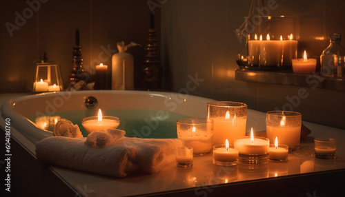 Glowing candlelight illuminates comfortable spa treatment table generated by AI