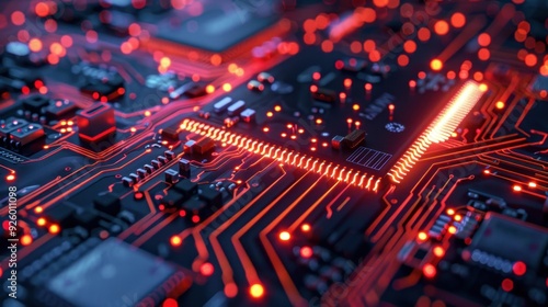 Glowing circuit board with digital particles.
