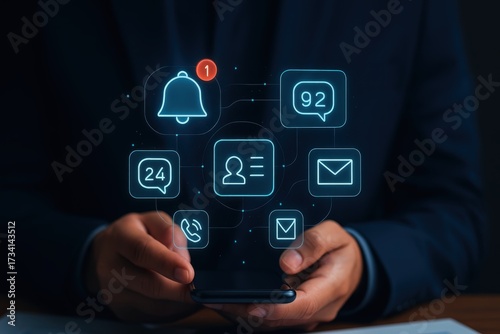 Glowing digital notifications are displayed above a person's hands holding a smartphone, indicating incoming messages, calls, and updates in a modern, technology-focused composition.
