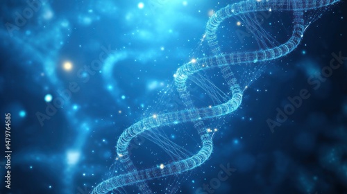 Glowing DNA double helix against a blue, sparkling background