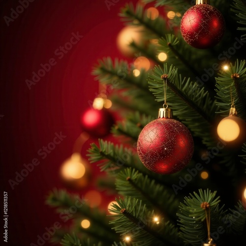 Glowing gold and red ornaments hanging on a large dark red glittering Christmas tree, christmas tree, festive lights, glowing hangings