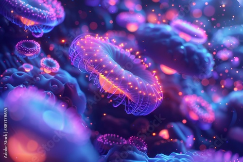 Glowing jellyfish in a vibrant underwater world with neon lights.