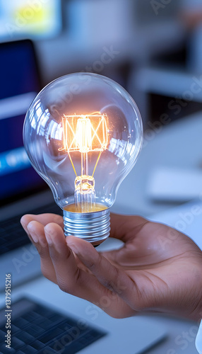 Glowing lightbulb held in hand, near laptop