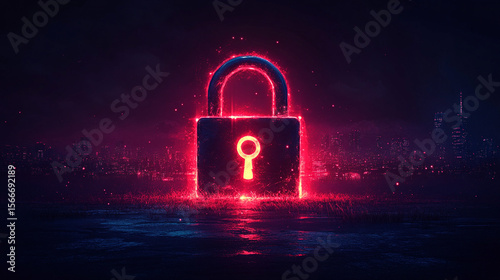 Glowing lock above city at night digital security