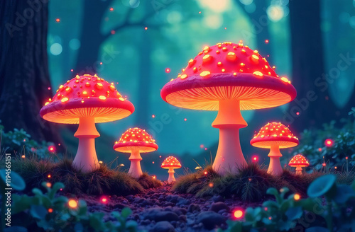 Glowing magic mushrooms close-up in a beautiful fairy forest. Fantasy.