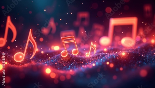 Glowing musical notes floating above colorful waves in a dynamic light show