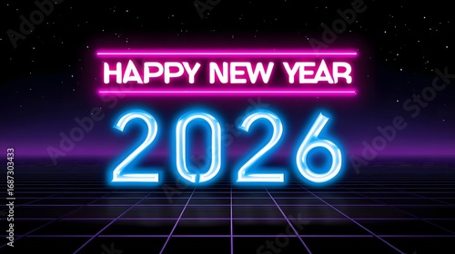 Glowing neon Happy New Year 2026 text displayed against a minimalist, retro-futuristic backdrop with a grid pattern and starry night sky.