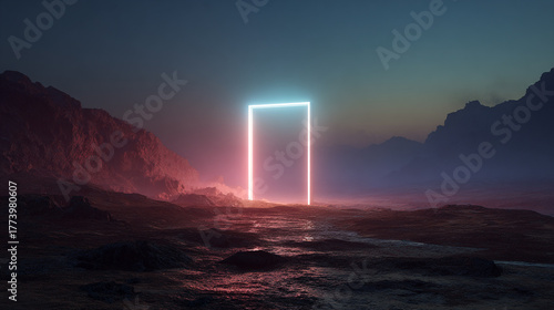 Glowing Neon Portal Illuminates a Mysterious Alien Landscape with Vibrant Blue and Pink Light, Evoking Futurism and Otherworldly Discovery.