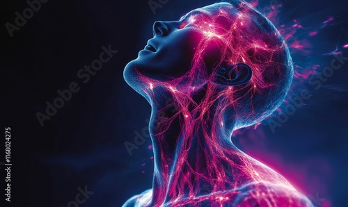Glowing network, head, neck, body, energy.