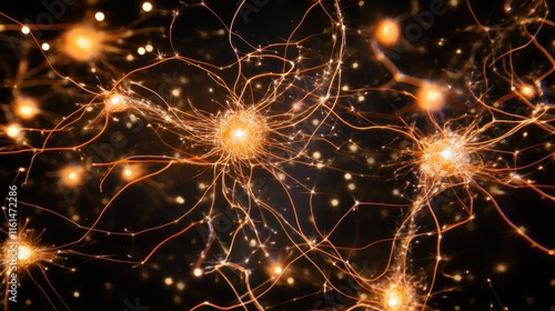 Glowing neural network connections; abstract representation of brain activity, neurons firing.