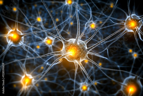 Glowing neurons network with synaptic connections highlighting neural activity