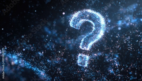 Glowing question mark formed from tiny particles against a dark, starry, abstract background