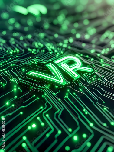 Glowing VR letters on a circuit board, representing virtual reality technology
