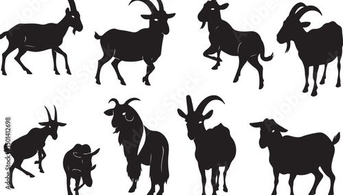 Goat Silhouettes Vector Illustration: Black and White Whimsical Horned Animals in Playful Poses for Agriculture and Farm Life Art