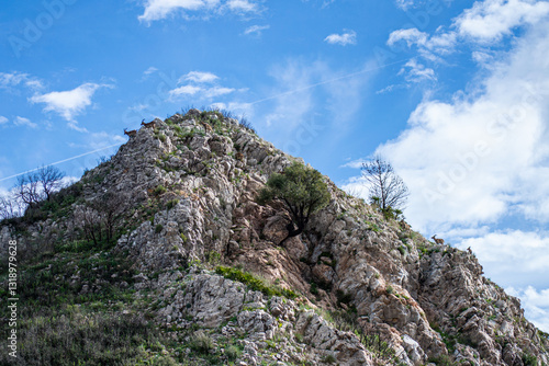 Goats on hiking trail along abandoned open-pit mine and burnt trees near Mijas, Spain