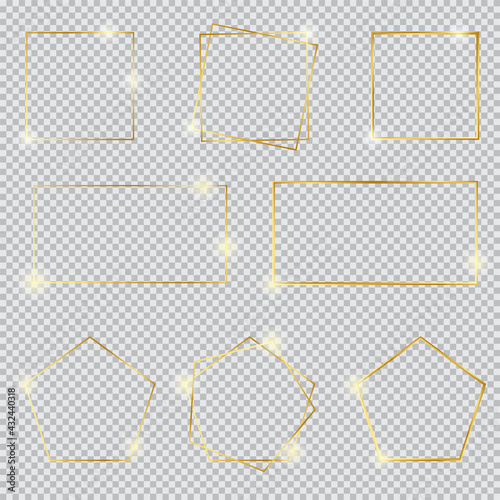 Gold border frame set with light influence, Gold decoration in minimalist style, Metal graphic paper elements in square, rectangle, polygon geometric thin lines.