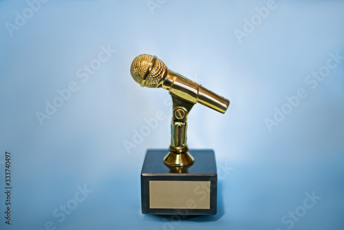 Gold, metallic microphone, mike, mic statuette, figurine medal award for musical achievement with place for title and text of winner on isolated blue haze sky paper background