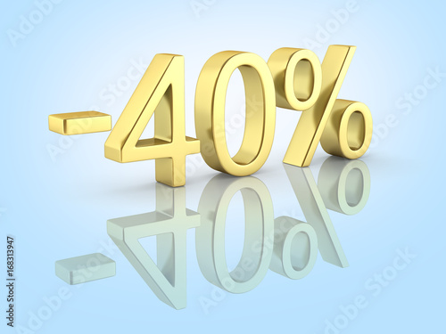 Gold text 40 percent off on blue gradient background with reflection 3D render