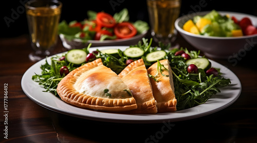 Golden brown pastry shines with soft lighting, showcasing a delicious main dish with salad for food photography.