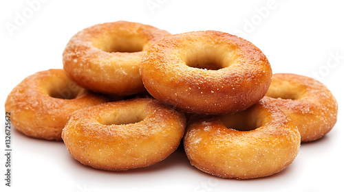 Golden brown sugar coated bagels stacked in pile, showcasing their soft texture and slightly crispy exterior. sugar granules add delightful sweetness to freshly baked dough
