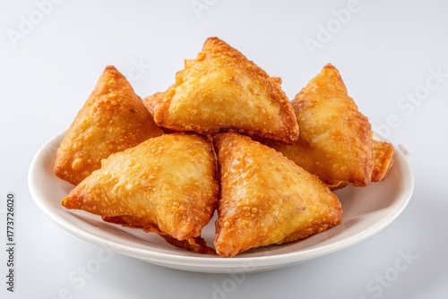 Golden brown triangular samosas piled on a white plate isolated on white background