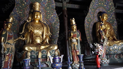 golden Buddha statues to pray in buddhism religion, located in ancient chinese tempe in china yungang caves