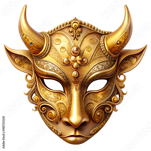 Golden Bull Mask: Intricate details and craftsmanship are displayed in a beautifully designed golden bull mask, blending artistry and symbolism. Highlighting the rich culture.